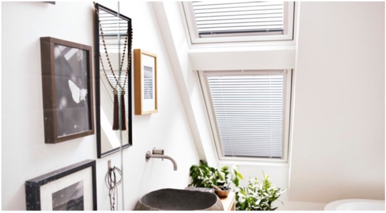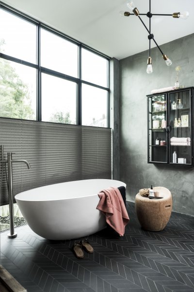 Grijze plisségordijnen in badkamer